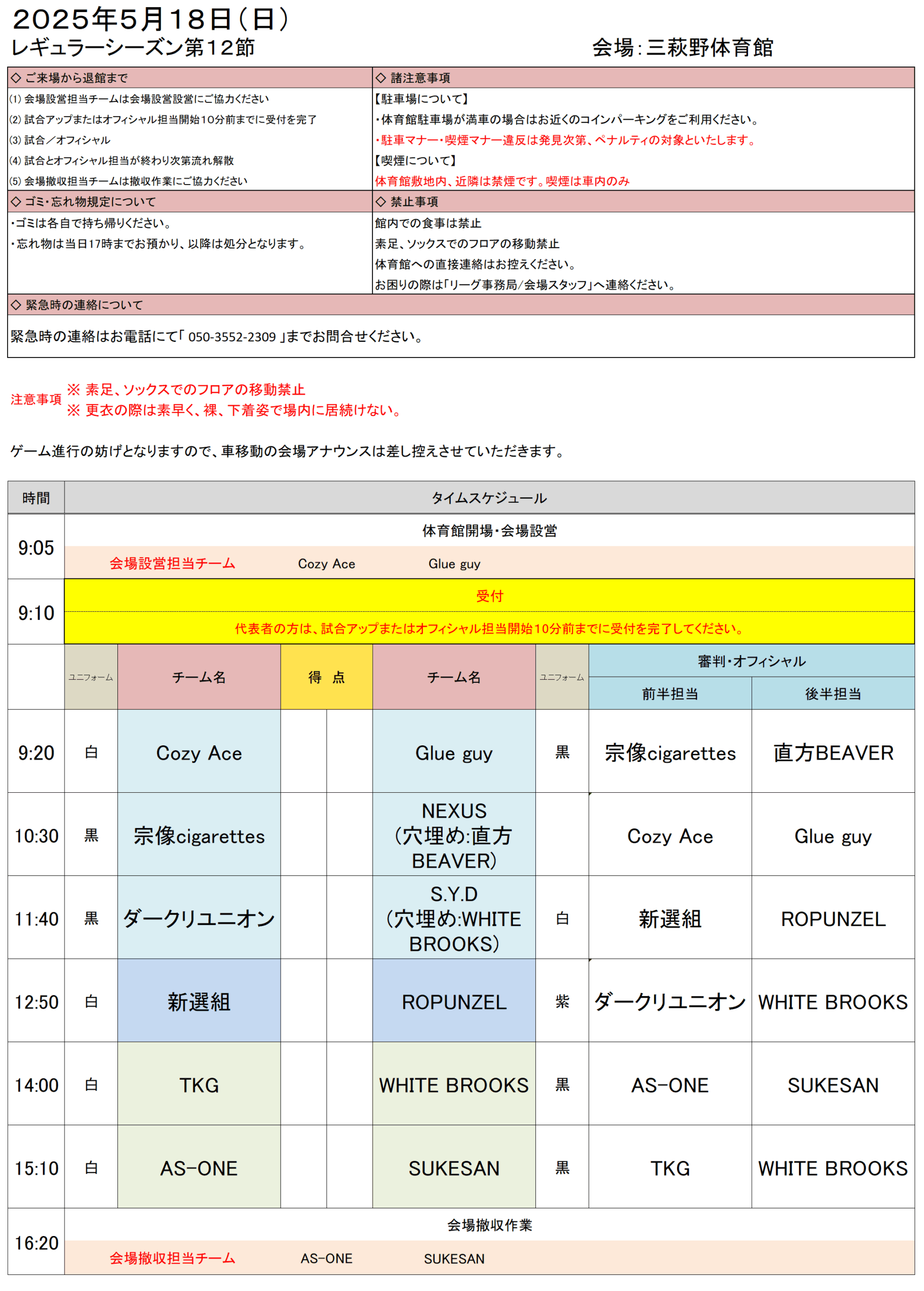 ▶スコアシート・ユニフォームカラー・会場・諸注意等の確認