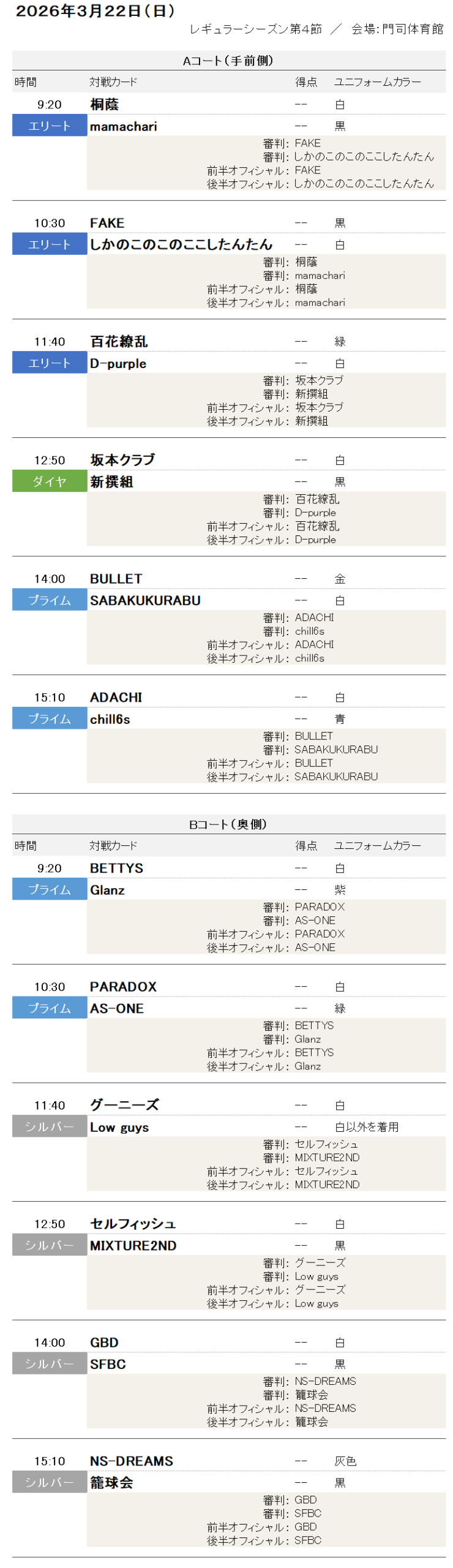 ▶スコアシート・ユニフォームカラー・会場・諸注意等の確認
